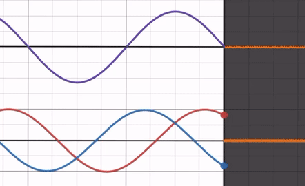下側のグラフは入射波・反射波・透過波を表していて、上側のグラフはそれらの合成波、つまり実際に観測できる波を表しています。