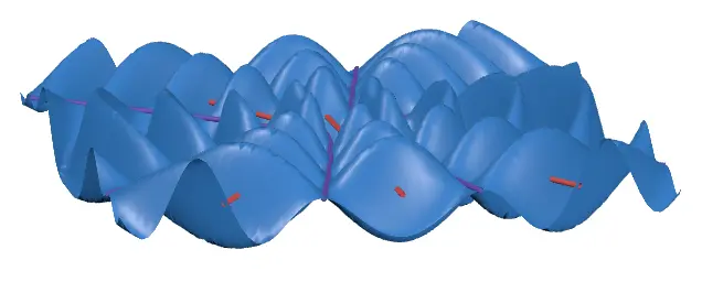 図のようなオレンジ色の水面波が表示されたはずです。次に波1というスイッチを切って、波2のスイッチを入れてみてください。