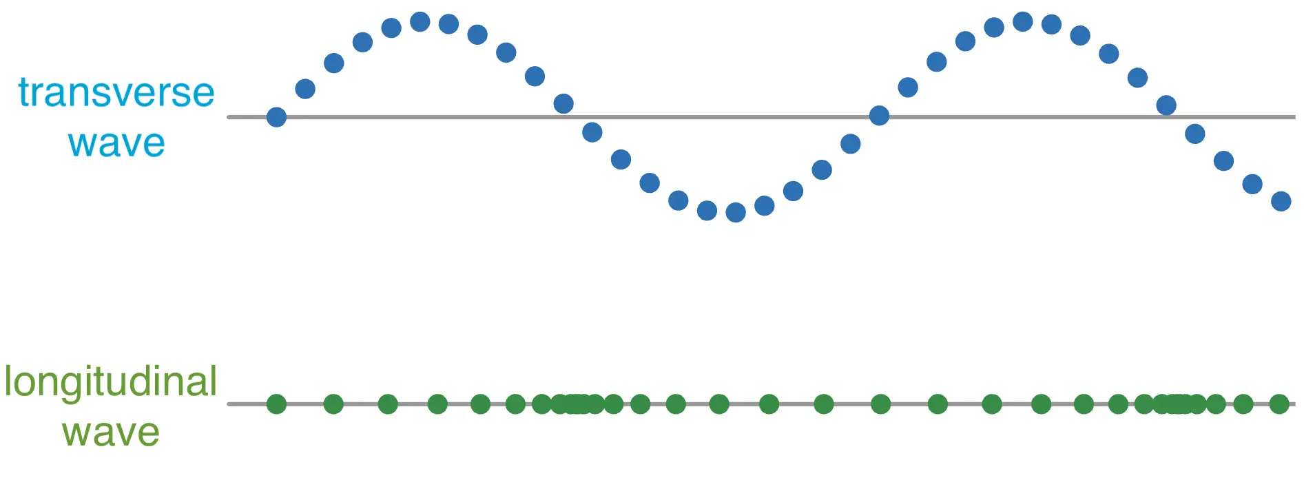 As shown in the image above, the shape of a longitudinal wave is quite different from that of a transverse wave. However, the medium's vibration direction is simply rotated by 90 degrees, so the medium still undergoes simple harmonic motion, just like in a transverse wave.